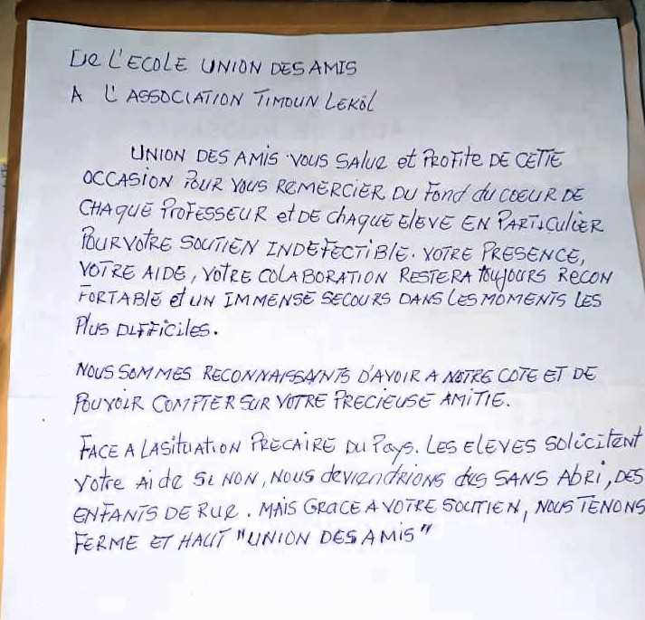 Jean-Claude François, le directeur de l’école Union des Amis nous a envoyé un petit mot à l’occasion de l’Assemblée Générale. Il nous dit combien notre action est précieuse pour eux. Vous pouvez le lire ici.